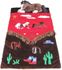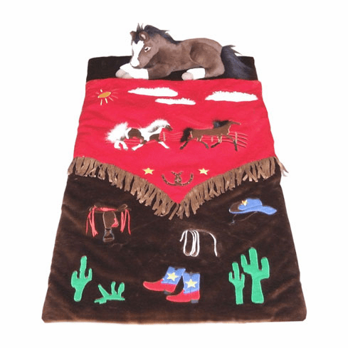 Embroidered cacti, western gear and soft fringe decorates the cozy Cowboy V Slumber Bag in deep brown and bright red with blue and green accents. Your little buckaroo can snuggle up in the 100% polyester plush fabric with the included stuffed horse pillow.