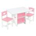 Set is the ideal place for homework, studying, reading, or creating masterpieces. Perfectly proportioned, the wood rectangular table has built in storage bins in pastel pink and purple. Conveniently tilted for easy access to markers, papers, or arts and crafts, the bins are easy to reach from either end of the table. With two chairs finished in a combination of white, pink and purple lacquer, both the table and chairs have heart-cut-outs.
