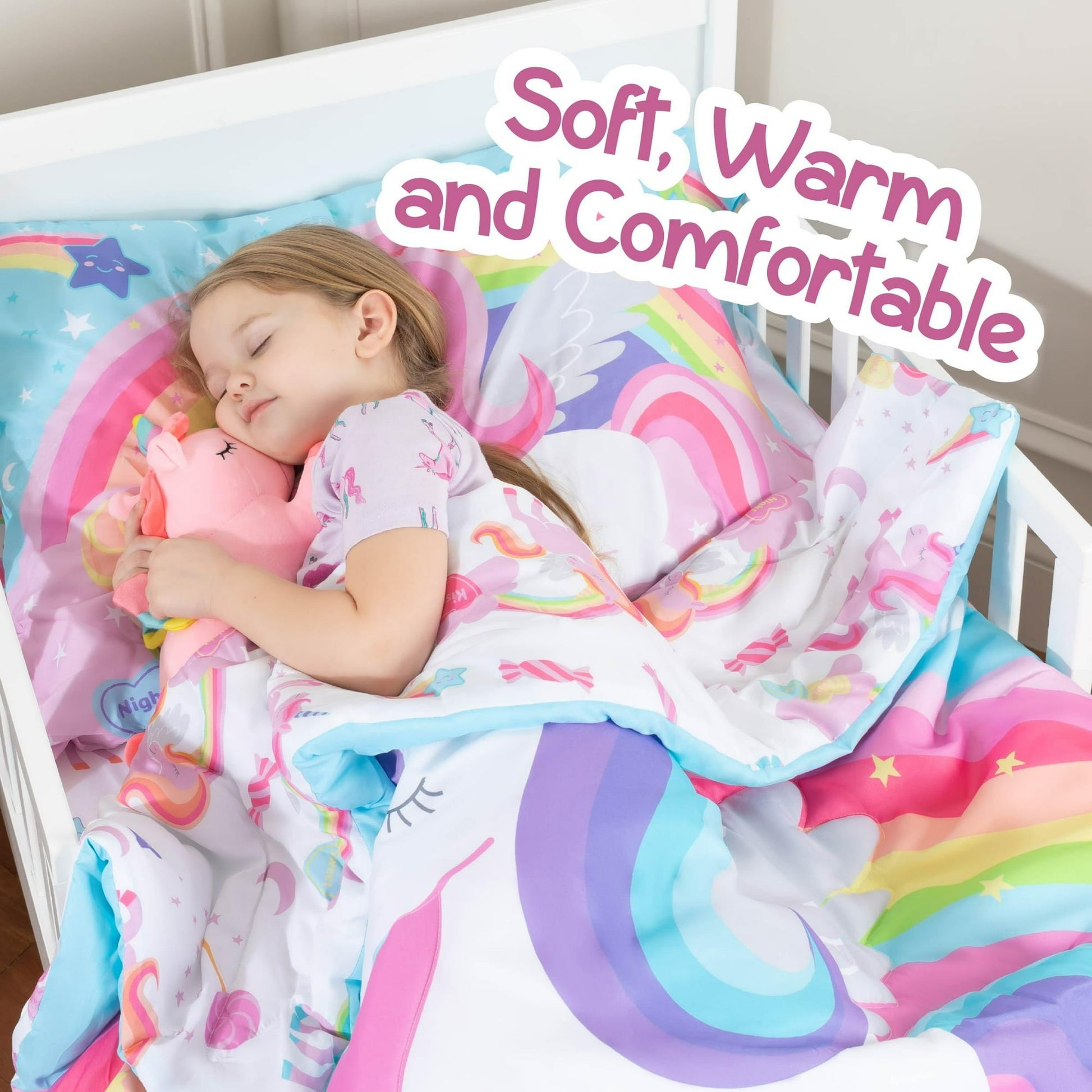 Featuring rainbows, castles, and smiling unicorns, this kids comforter set transforms any room into a magical retreat. Whether updating a nursery or setting up a new space, it's a fun and functional little girl bedding option that adds joy and personality to bedtime.